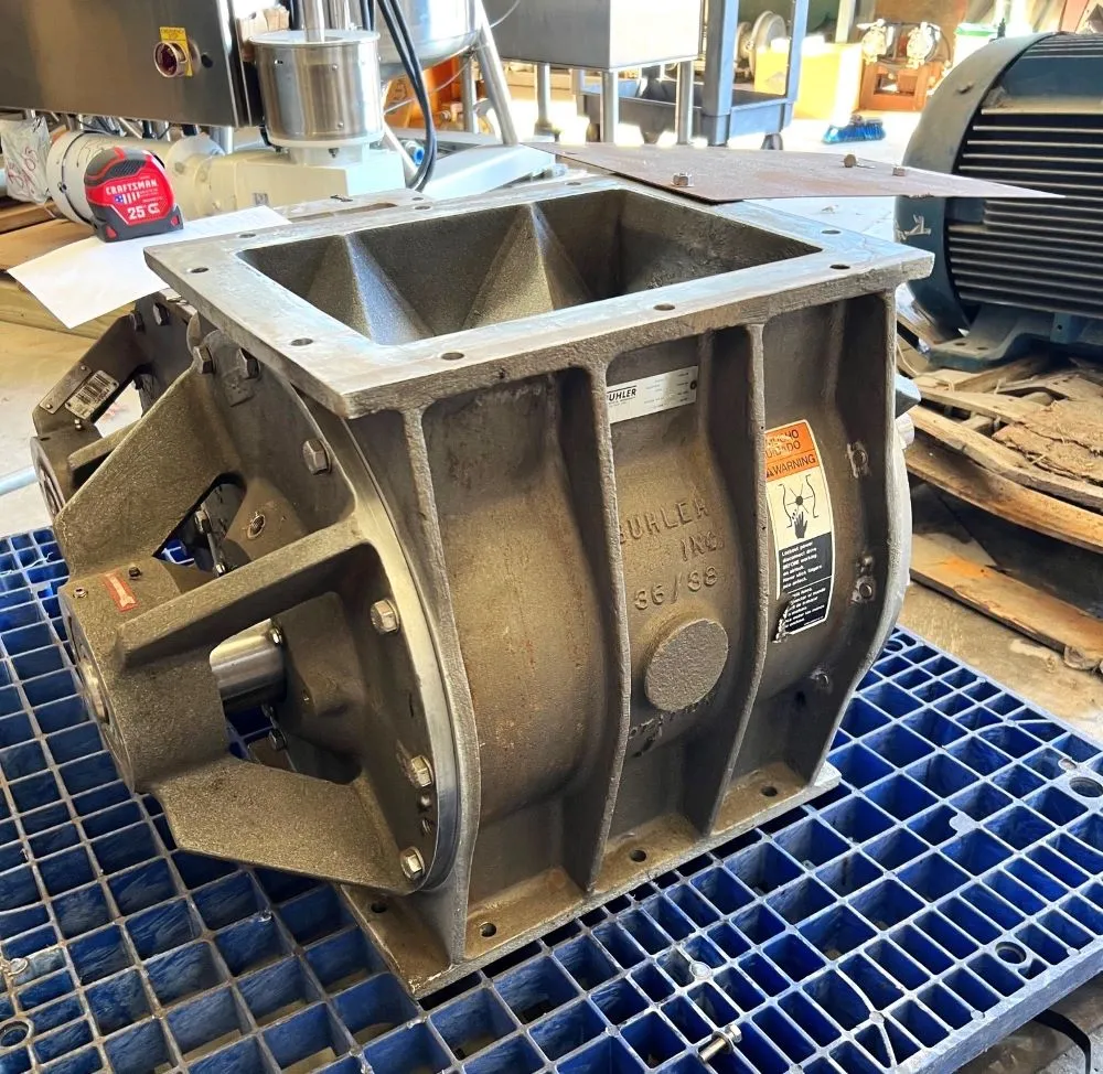 10" X 14" STAINLESS X 19" HT. BUHLER AIRLOCK ROTARY AIR LOCK VALVE/FEEDER. Type: USF 36/38. Serial# 549 507 42. Radial: 8/1000 IN. Axial: 9/1000 IN. Bypass Air at 15 PSI and 20 RPM: 195 SCFM. 304 STAINLESS.