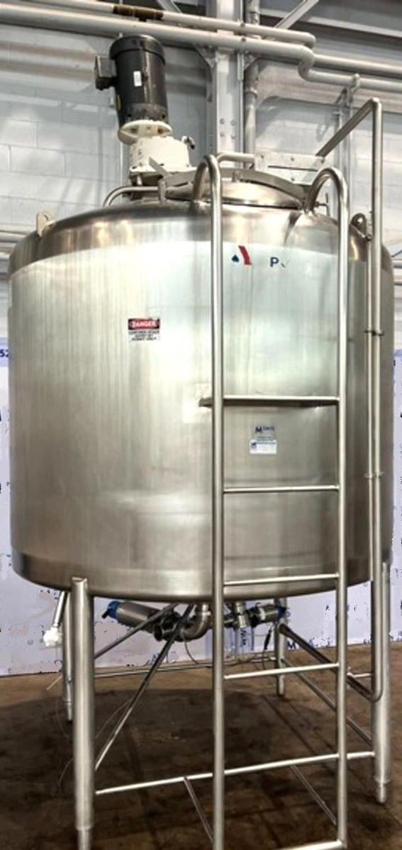 1000 gallon APV Sanitary Stainless Steel Dish Bottom Mix Tank. Has top mounted 7.5 HP, 208-230/460 volt, 1755 rpm motor into gear reducer mixer with high shear mixing blade. Blade is 15" Dia. x 4.25" high. 6' dia.x 4'6" T/T. Approx 11' OAH.