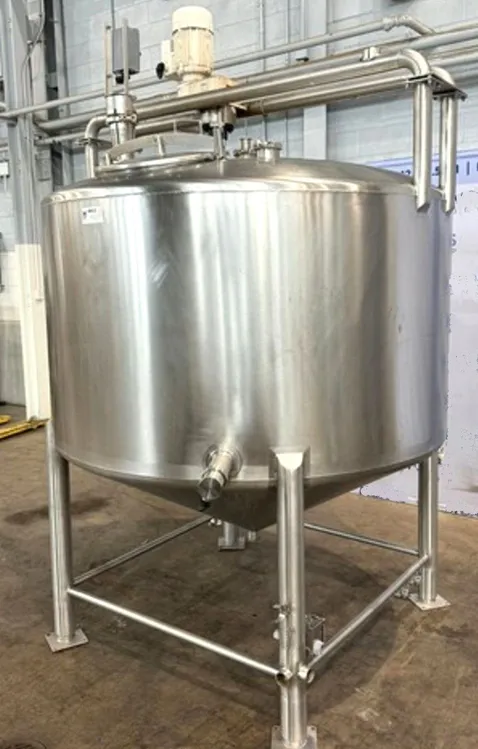 500 Gallon Stainless Steel Sanitary Cone bottom Mix Tank. Top mounted Mixer. Top mounted Spray balls for CIP. 5' dia.x 3' T/T. Approx 9' OAH.