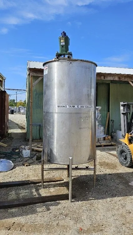 600 Gallon Stainless Steel Mixing Tank. Equipped with Lightnin Air operated agitator (pneumatic mixer). 4' diameter x 6'8" T/T, 11' Overall Height. Slope bottom to 1.5" Side Bottom Outlet. Previously used in sanitary application.