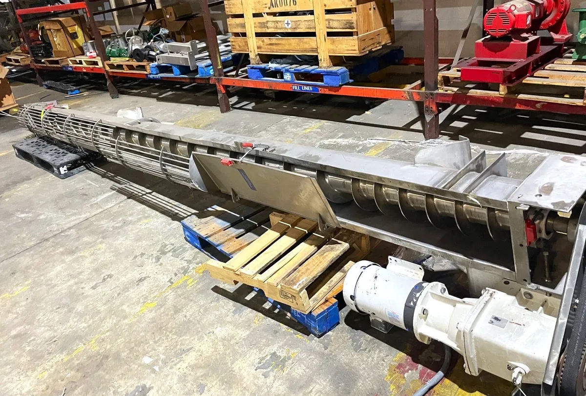 Used Stainless Steel Sanitary Screw Conveyor. Approx. 10" Width x 17' Length. Driven by Baldor 3 HP Motor, 1750 RPM Motor, 108-230/460 Volts, 3 Phase. Last used in sanitary food facility.