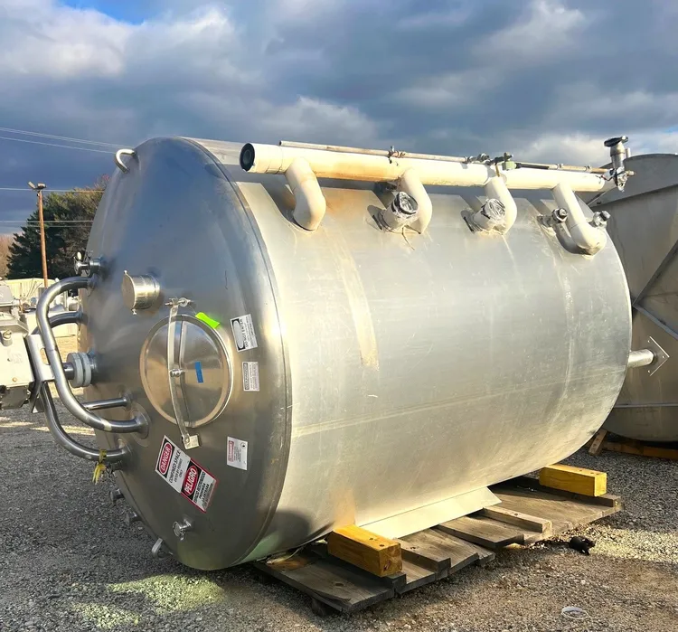 2,000 Gallon Feldmeier Stainless Steel Sanitary Jacketed Mix Tank / Processor / Pasteurizer. Jacket rated 100 PSI at 350°F. Driven by 3HP, 1705 RPM, 3PH Nord Motor. 7' dia. x 8' T/T. 3" bottom outlet. 13'6" Overall Height. 18" Top Manway. 20" x 16" Bottom Manway. Last used in food facility.