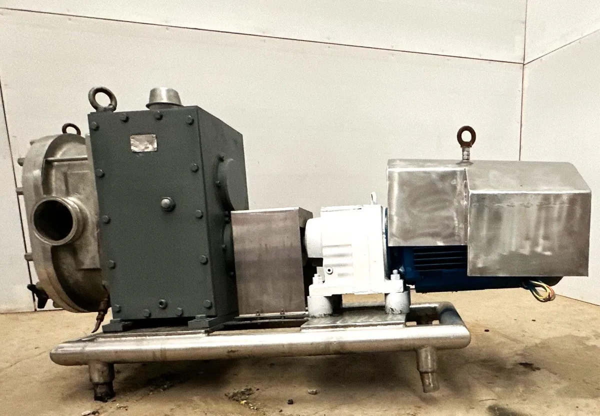 used FRISTAM Model FKL250, Heavy Duty 4" Rotary Lobe pump. Max speed 600 rpm, Max PSI 300. 15 HP, 230/460 volt, 1780 rpm Sew-Eurodrive motor into gearbox with 5.99:1 ratio. Video of unit running available.