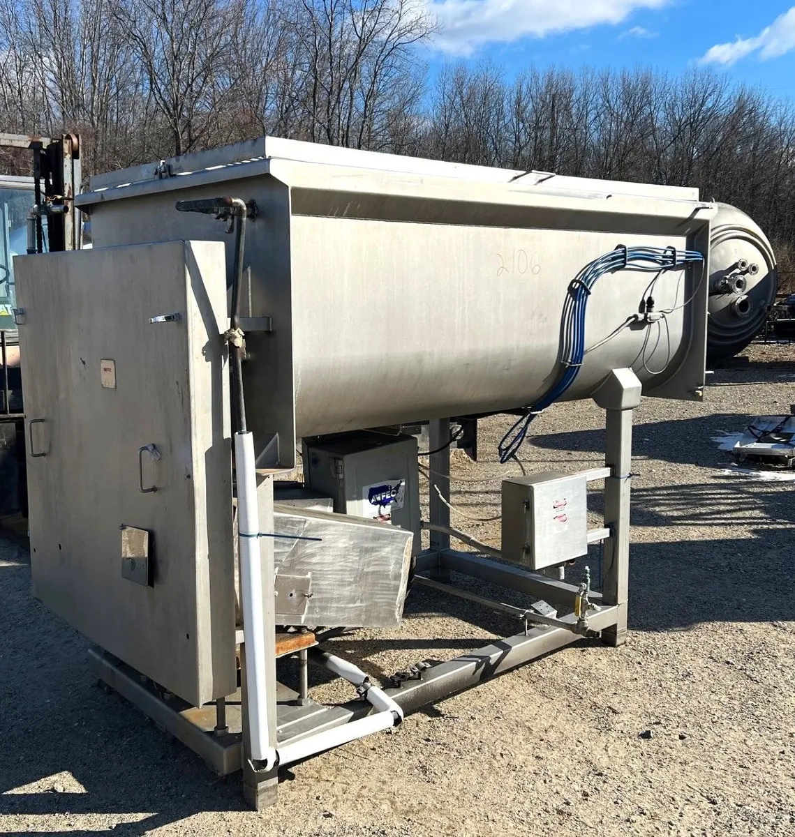 AMFEC Model 510 Twin Shaft Mixer. Rated 2500 LBS. (2) 7.5 HP drives. 10 Amps. 440 Volt. 60 CY. 3 PH. Sanitary Food grade. All stainless steel construction. Trough dimensions: Approximately 44.5" wide x 84" long x 32" deep. Approximately 37" discharge height. Approximate weight 2,000 pounds. Approximate overall dimensions: 54" wide x 106" long x 68" high. Video of unit running available.