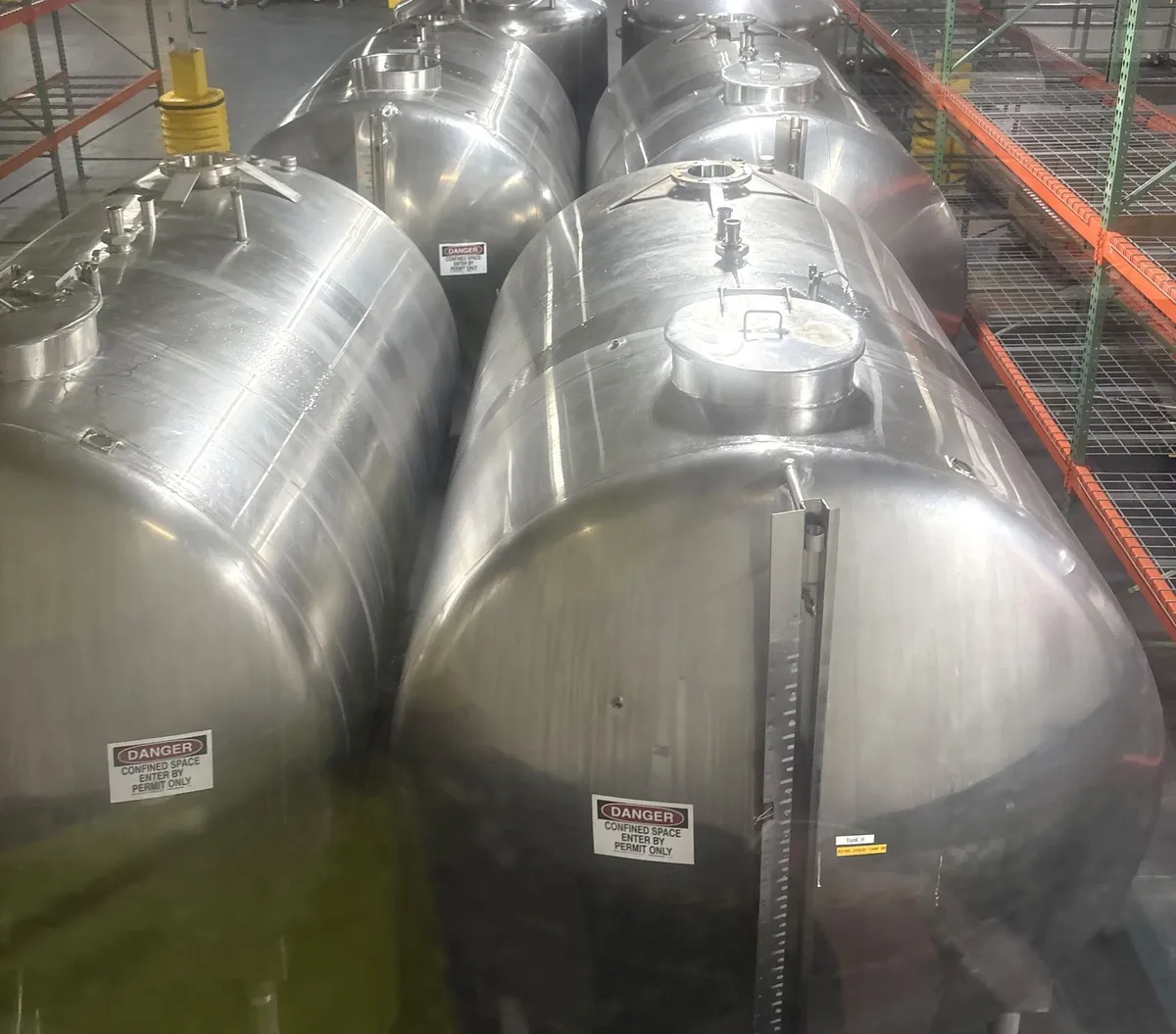 Qty (2) 2800 Gallon Potter & Rayfield Style H Stainless Steel Horizontal Storage Tank. Sanitary Stainless Steel. Dimensions: 7' Diameter x 8'7" T/T, 10' Overall Length, 8'8" Overall Height. 2" Diameter Bottom Outlet. 20" Top Manway. (2) CIP Spray Balls. Last used in Beverage facility.