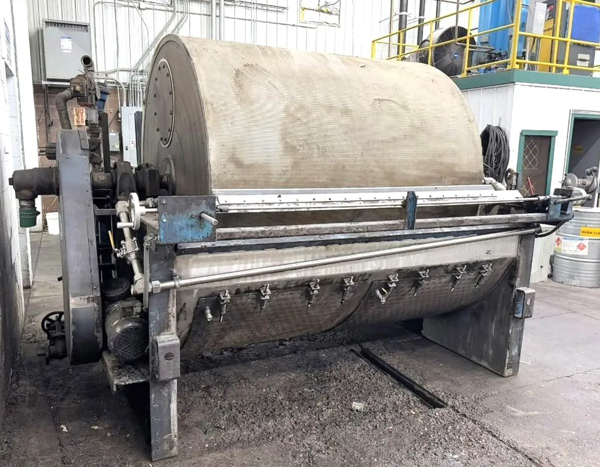 Alar 6X6 Auto-Vac Stainless Steel Rotary Vacuum Drum Filter, Model 660, Serial# 16308. Auto advancing Knife Discharge. Built 2015. 304 Stainless Steel. Includes Skid with 40 HP XP Vacuum pump, control panel, receiver, pumps and assorted spare parts.