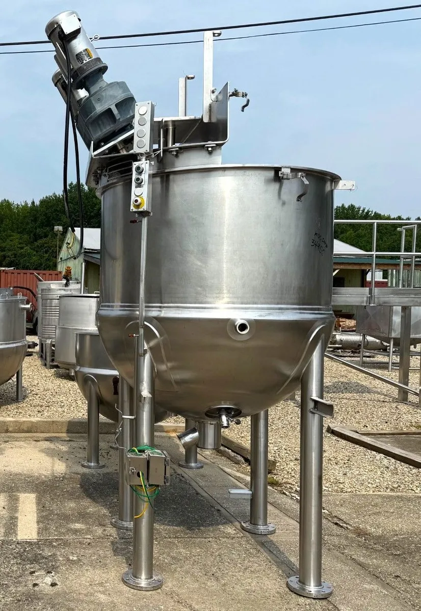 300 Gallon Groen Double Motion Inclined Agitation Jacketed Kettle. Scrape agitation with "Tree" style secondary mixer. Jacket rated 90 PSI @ 332 Deg.F.. Jacket tested good. 3 HP Drives. Video of unit running available. Need Two? See sister unit Stock# 2158.