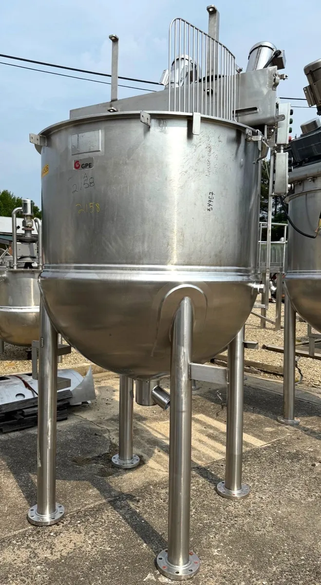 300 Gallon LEE Double Motion Inclined Agitation Jacketed Kettle. Scrape agitation with "Tree" style secondary mixer. Jacket rated 90 PSI @ 332 Deg.F.. Jacket tested good. 3 HP Drives. Video of unit running available. Need Two? See sister unit Stock# 2157.