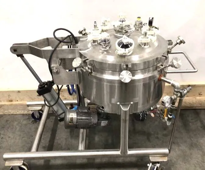 60 Liter (15 Gallon) LEE Sanitary Reactor / Fermenter with bottom mounted Mixer. Internal Rated 45 PSI / Full Vacuum (FV) @ 300 Deg.F.. Jacket rated 100 PSI @ 338 Deg.F.. Has lift off lid with air actuator assist. Jacket tested. Portable on wheels. Bottom mounted mixer. Video of unit running available.