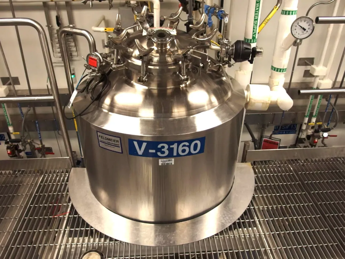 Qty (2) Feldmeier 1000 Liter (264 gallon) Sanitary 316L Stainless Steel Jacketed Reactor / Fermenter Vessel. Equipped with bottom mounted mixer / agitator. Rated 50/FV (Full Vacuum) PSI @ 400F, MDMT -20F @ 50/FV PSI Jacket: MAWP 100/FV PSI @ 400F, MDMT -20F @ 100/FV PSI
