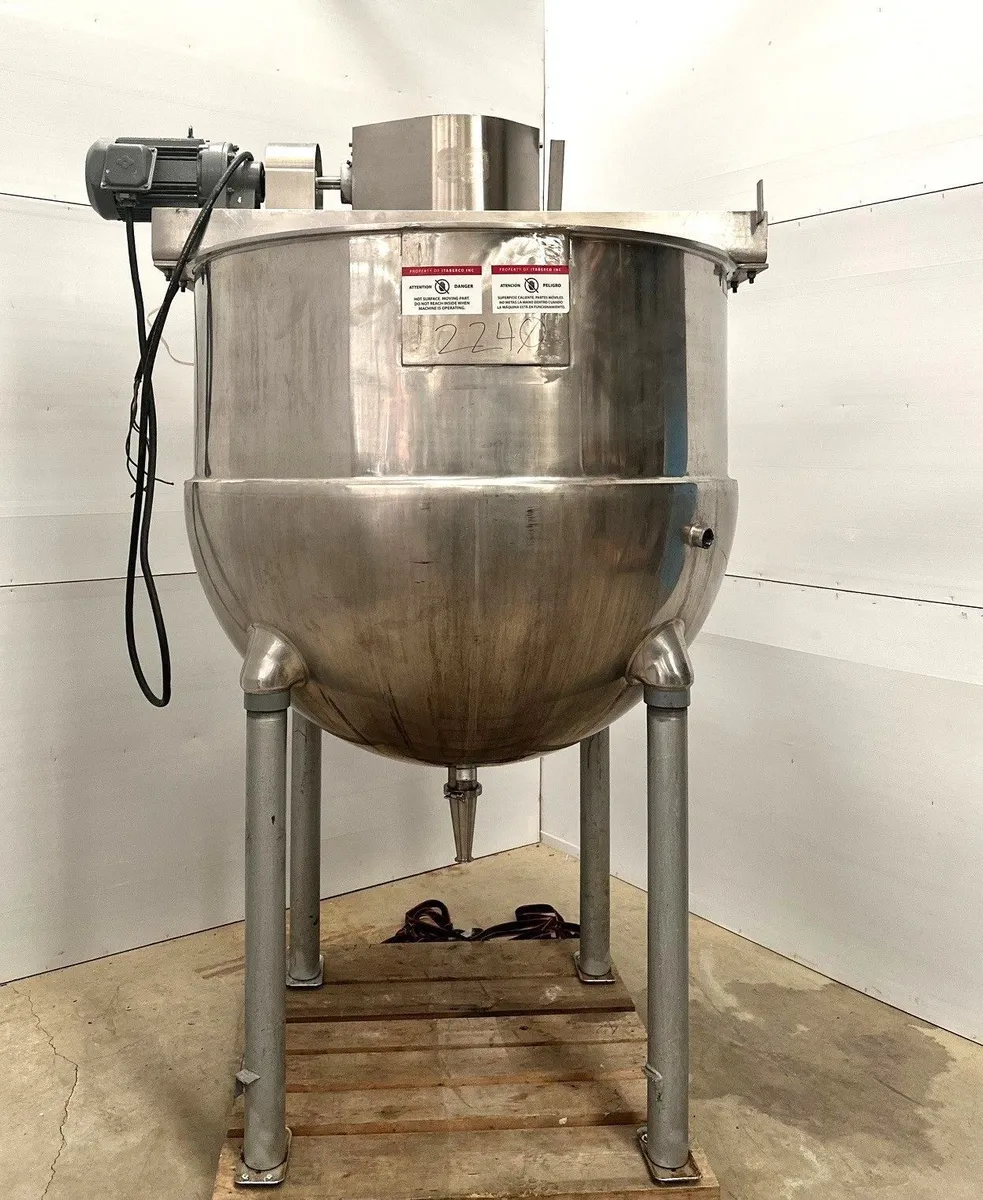 GROEN 350 Gallon Jacketed Mix Kettle with Double Motion Scrape Agitation model INA/2-350. Jacket rated 100 PSI @ 338 Deg.F.. 3 phase, 240 Volt motor. Last used in sanitary food plant. Jacket test good. Video of unit running available.