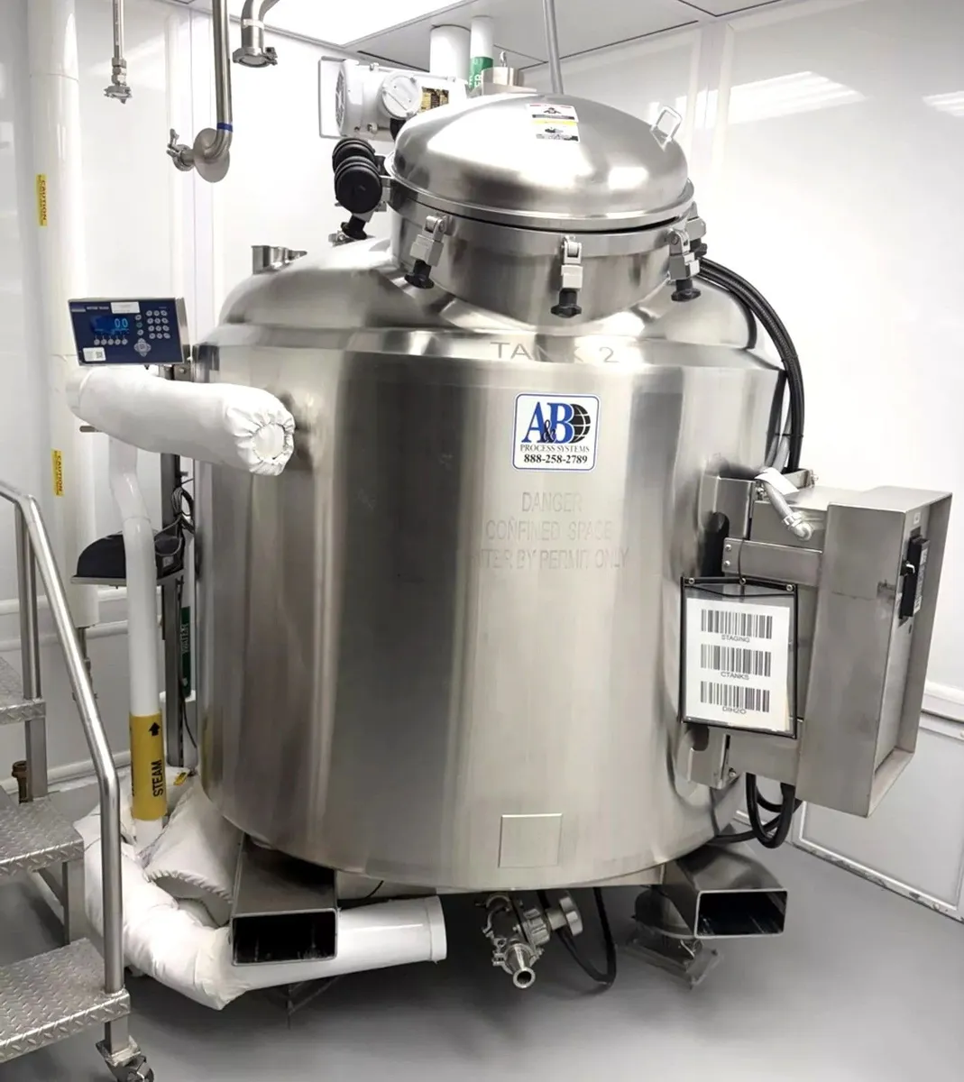 600 Gallon A&B Process Sanitary Stainless Steel Reactor / Fermenter. Rated 15 PSI/Full Vacuum @ 350 Deg.F.. Jacket rated 150 PSI @ 350 Deg.F.. Top mounted Lightnin model SR15S100, 1 HP, 230/460 volt Explosion Proof Mixer. Bottom flush mount valve. Unit mounted on load cell with readout and printer.
